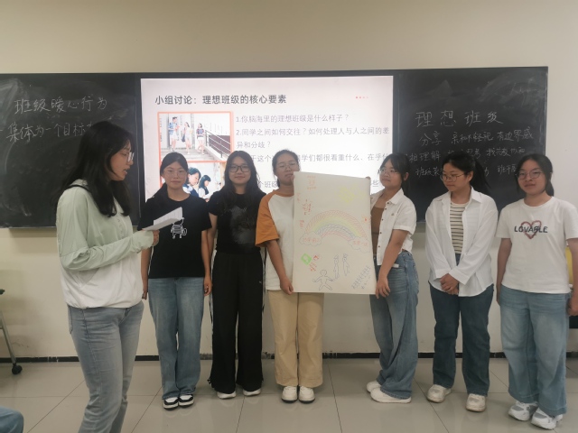 本次叙事班会打破“老师说、学生听”的常规,以“讲述—提炼—行动”为轴,把班级建设的话语权交还学生。班会伊始,刘冰倩同学率先分享“文科生拔河逆袭理科生”的爆笑往事,故事被提炼为“为一个目标集体拼命”,首登黑板左侧的“暖心行为榜”。随后五组同学接力讲述“我曾被照亮的那一瞬间”,情绪在圆圈中快速升温; 三分钟冥想后,五支画笔同步落地,关键词“尊重、互助、生长”被涂成五幅愿景图,最终拼接成电子班徽《萤火微光》:一双托举朝阳的手。下课前,每位同学写下今日即可践行的“微行动”:帮室友整理琴谱、主动倒垃圾、记录班级笑脸……辅导员章洁老师总结:“愿景不是海报,是每天做一件温暖的小事;四年,就是1460次奇迹。”