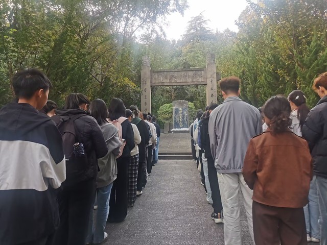 在师德教育馆,同学们跟随讲解员的步伐,依次参观了“师德溯源”“师德风范”“师德践行”“师德警示”四大主题展区。一件件实物、一幅幅照片、一段段视频,生动呈现了陶行知“捧着一颗心来,不带半根草去”的崇高师德,以及新时代优秀教师张桂梅、李保国等人的感人事迹。参观过程中,同学们不时驻足凝视,轻声交流,在“沉浸式”体验中深刻领悟“学高为师,身正为范”的内涵。在庄严肃穆的陶墓前,同学们俯身献上亲手折叠的朵朵小白花,集体默哀一分钟,深切缅怀伟大人民教育家陶行知先生。“千教万教教人求真,千学万学学做真人!”面向墓碑,全体新生高举右拳庄严宣誓,铿锵誓言在行知园上空久久回荡。