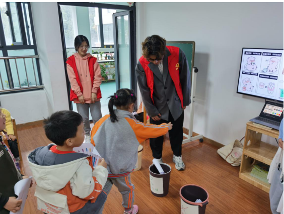 桑园蒲幼儿班是典型的农村幼儿园。大家来到幼儿园后,首先与这里的老师们交流,了解幼儿园的班级、课程与教学等方面的情况,并向幼儿园赠送了儿童绘本。随后,志愿者走进班级,围绕社会主义核心价值观中的“文明”“和谐”“诚信”等元素为孩子们带来了丰富多彩的课程活动。志愿者通过编顺口溜、开展垃圾分类投壶小游戏等活泼生动的形式,在互动游戏中让小朋友们快速地掌握了垃圾分类的方法,教育孩子们要爱护生态环境,保卫地球家园;将中国传统典故“曾子杀猪”的故事进行情景演绎,教育小朋友做人要言而有信,诚实待人;通过组织小朋友在纸盘上绘画,号召大家节约粮食,好好吃饭,积极参加“光盘行动”。教室里,孩子们积极与志愿者互动交流,欢笑声此起彼伏,现场气氛活跃。
