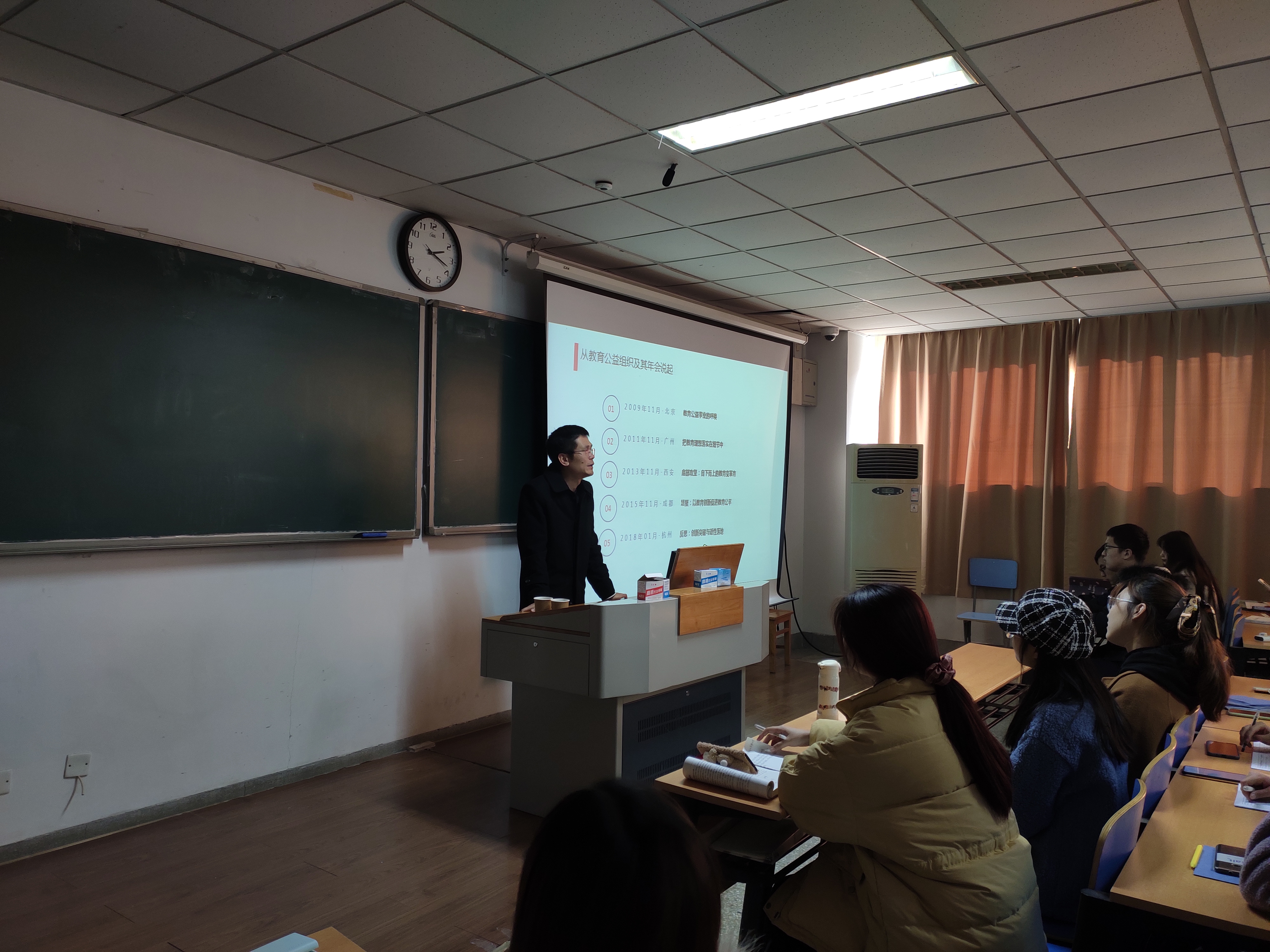 赵宏智研究员担任社工志愿者十多年,常年在云南、甘肃等地义务支教,曾任北京西部阳光农村发展基金会秘书长,深耕中国西部乡村教育,对中国乡村幼教事业多有心得和实践,个人事迹被中央电视台纪录片频道关注,并持续拍摄,今年9月以《磑子坝的春天》报道播出。讲座现场,赵老师结合自身支教经历,介绍了我国公益支教的现状以及国家相关政策。他指出,现在的公益支教应更注重专业化和规模化。他呼吁同学们亲身践行陶行知老先生扎根乡村教育的初衷,发扬志愿精神和专业优势投身乡村基础教育事业。同学们聚精会神地听讲,积极与赵老师问答互动。