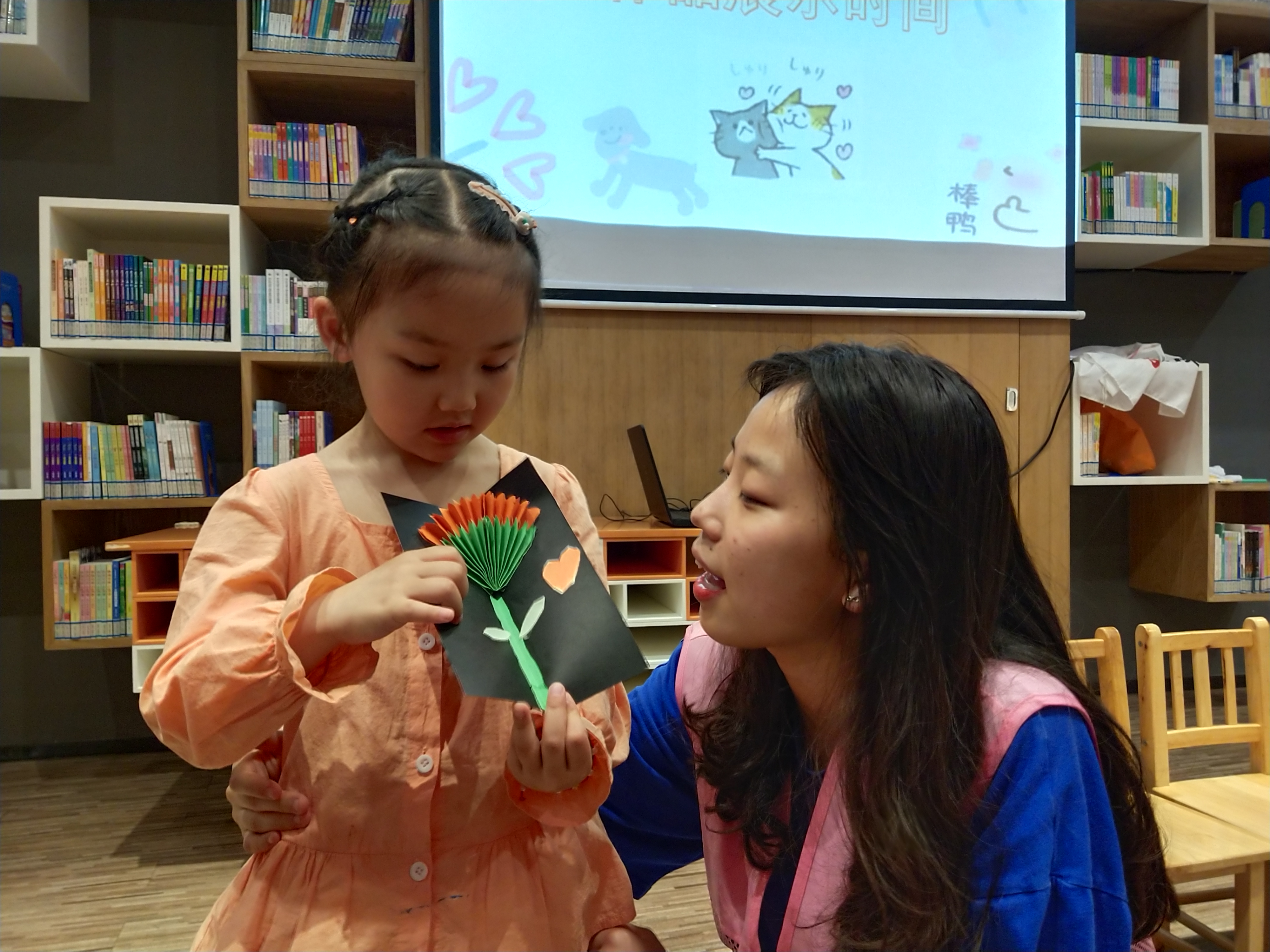上午十点,活动正式开始。小朋友聚精会神,认真听志愿者讲小浣熊为妈妈寻找礼物的故事,并积极与志愿者互动。绘本分享结束后,小朋友在志愿者的帮助下完成了康乃馨贺卡的制作,并在贺卡上写下想对妈妈说的话。之后,小朋友们将自己亲手制作的康乃馨贺卡送给妈妈,并且向妈妈表达“我爱你,妈妈”。